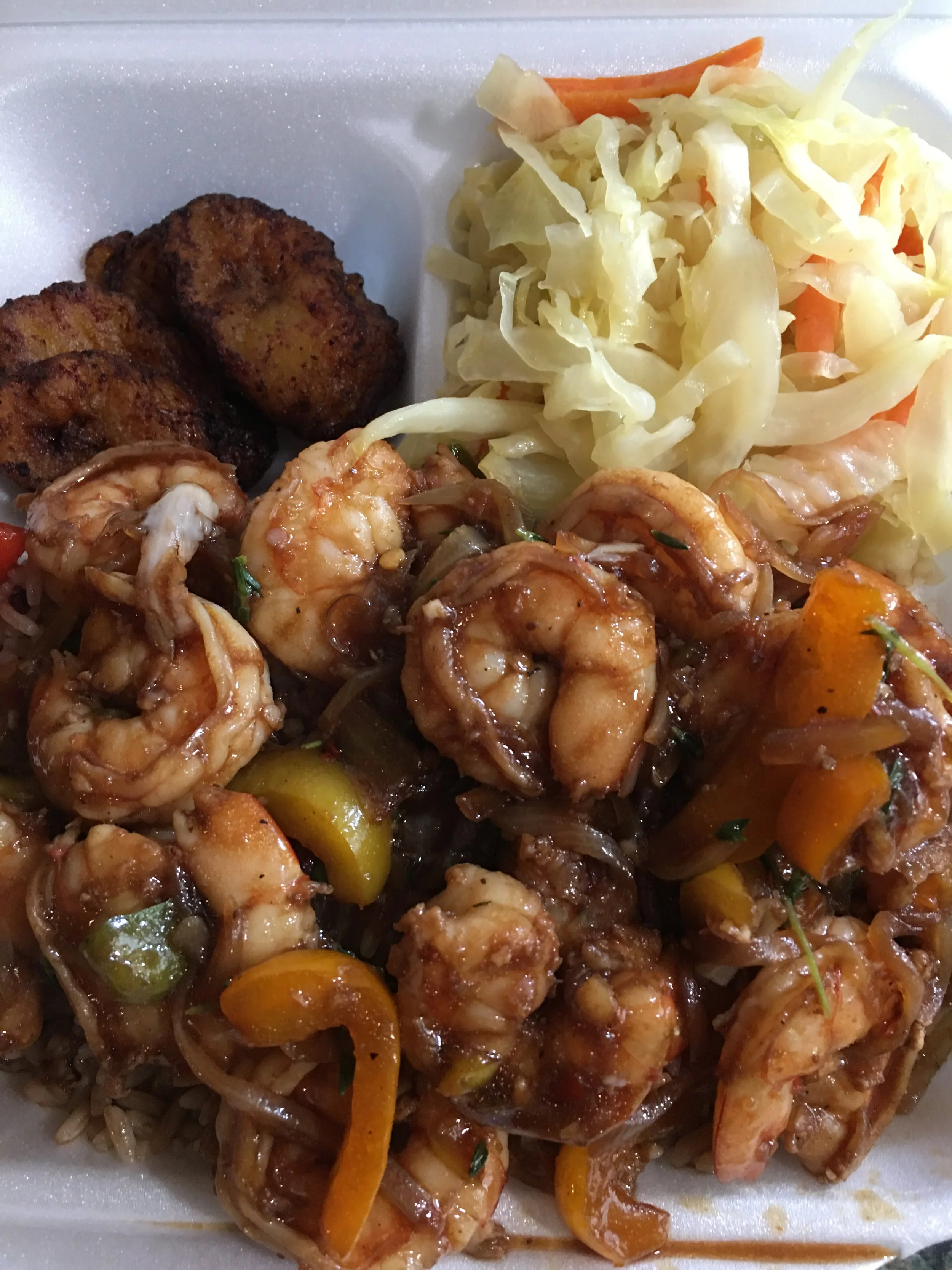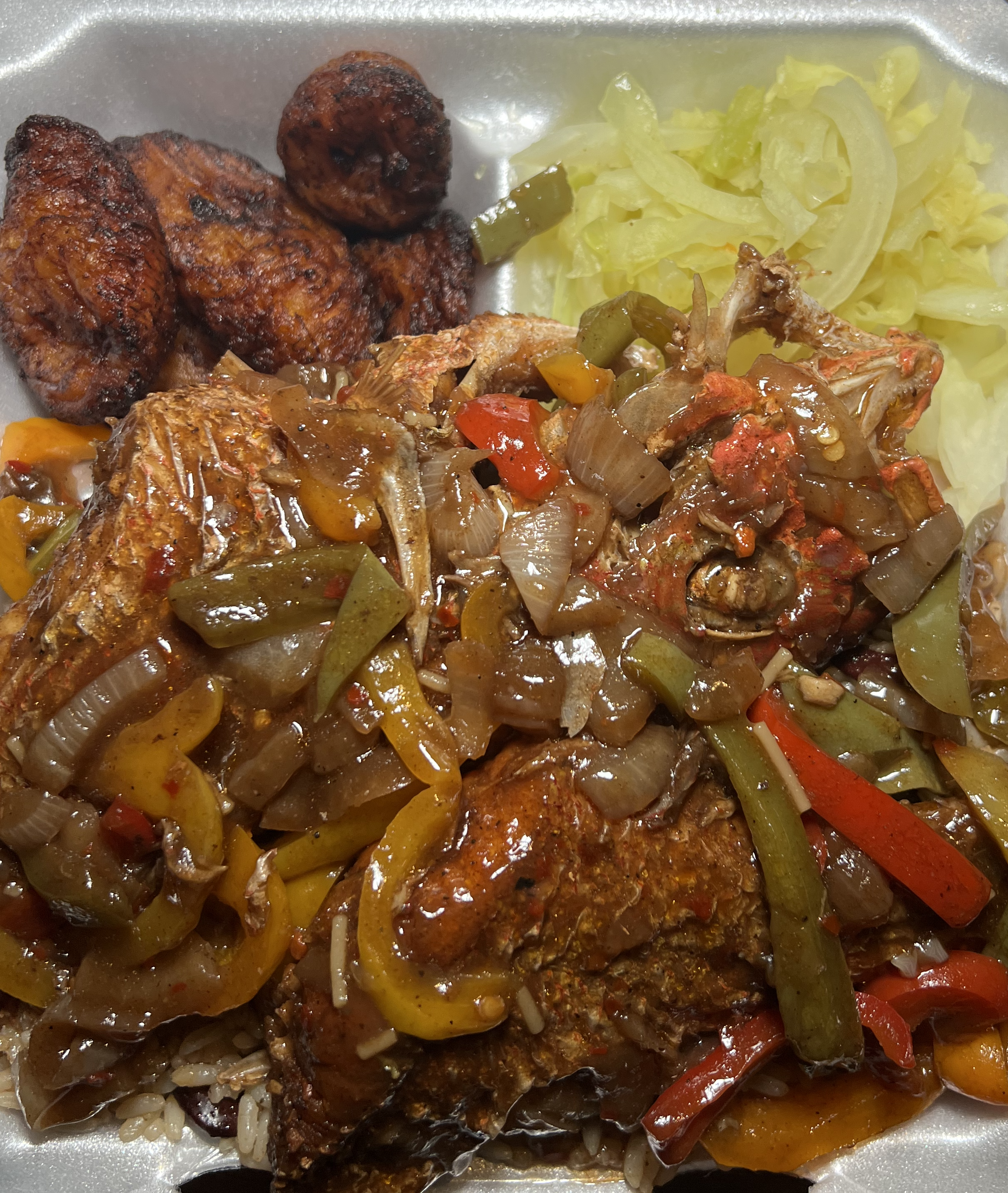 Choice of curry, steamed, jerk, battered & fried, or scotch bonnet spicy butter. Served with white rice or rice & peas, cabbage, and sweet plantains.