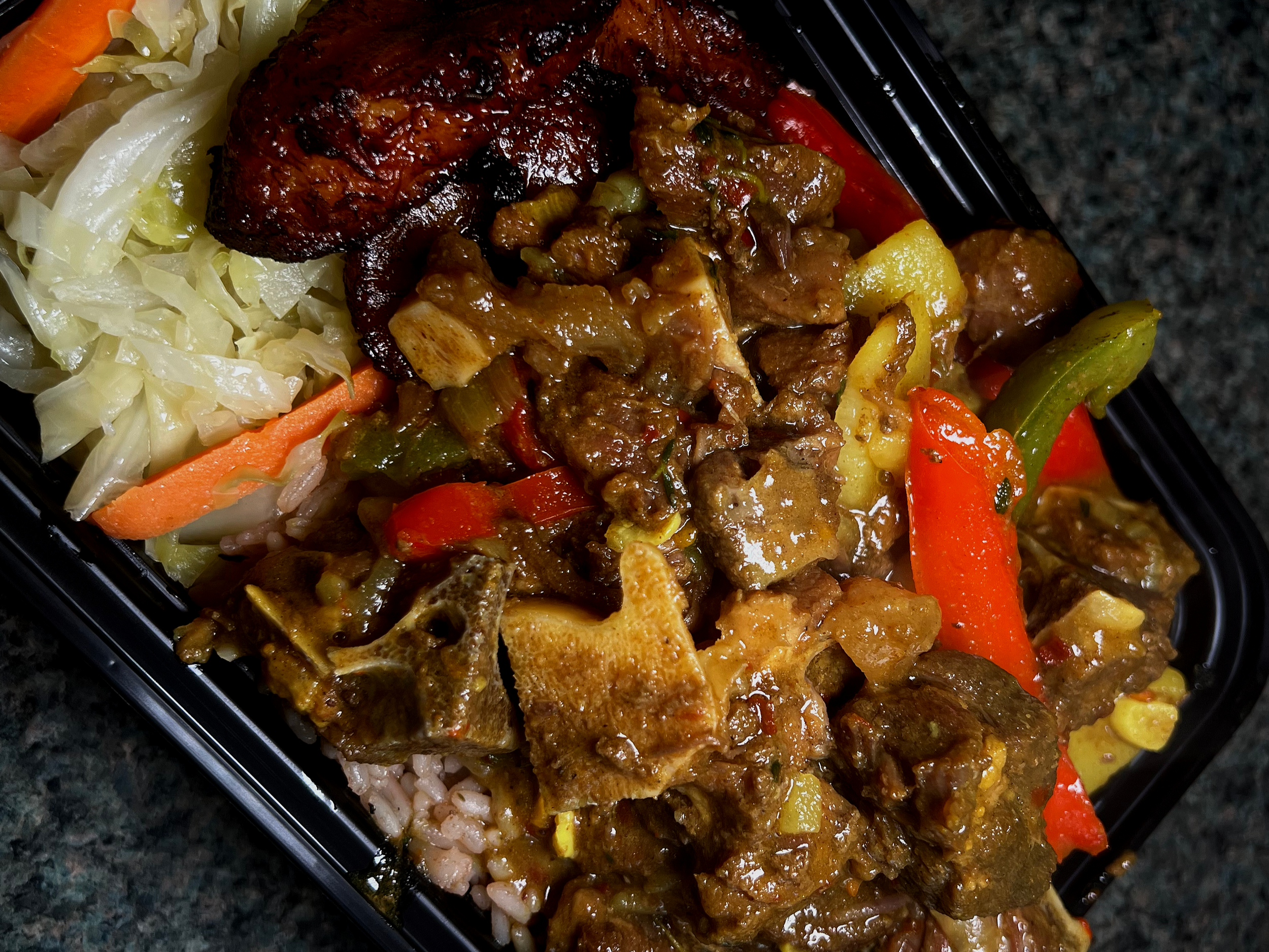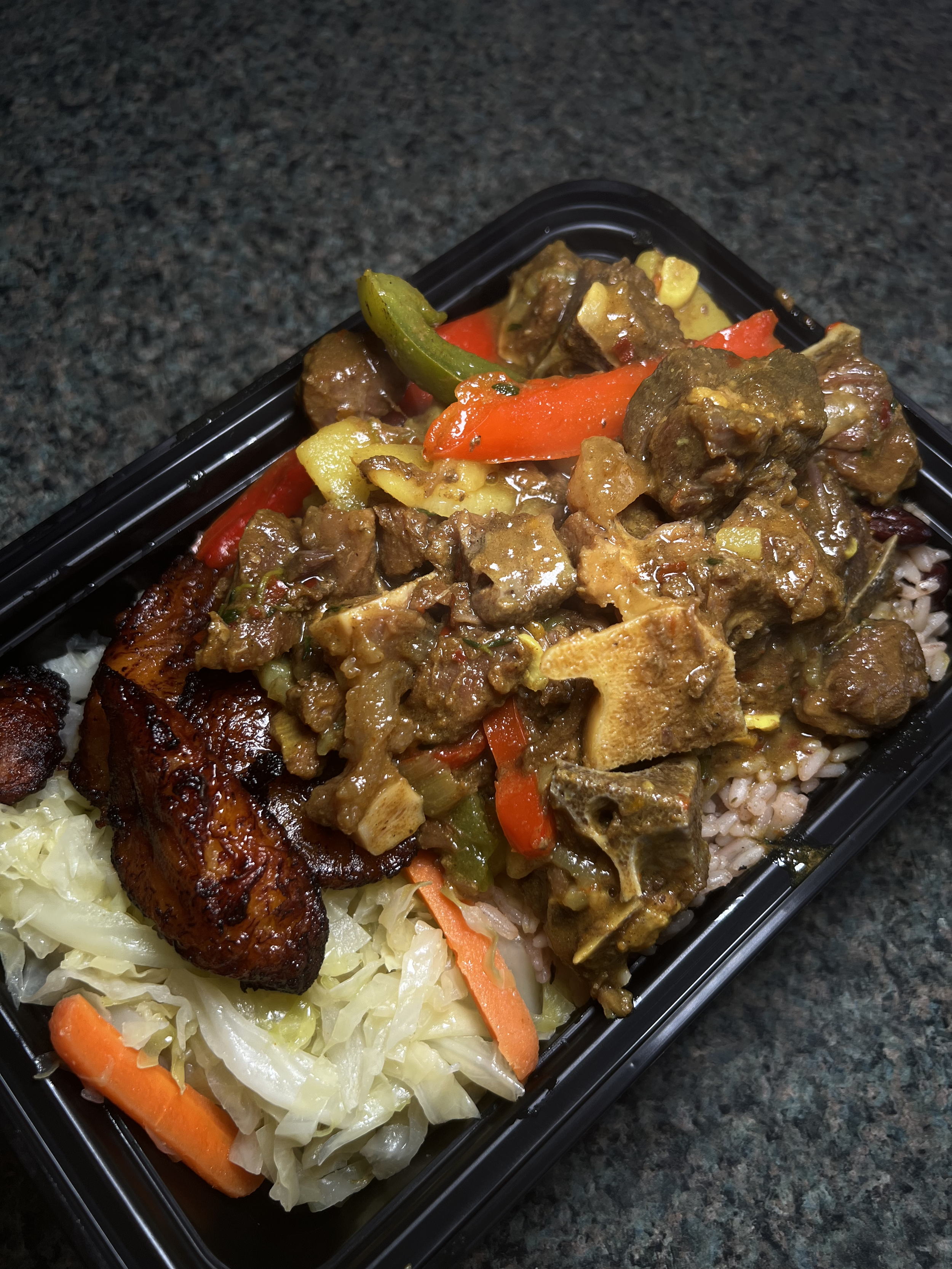 Slow-cooked in brown sauce, served tender with butter beans, rice & peas, cabbage, and sweet plantains.