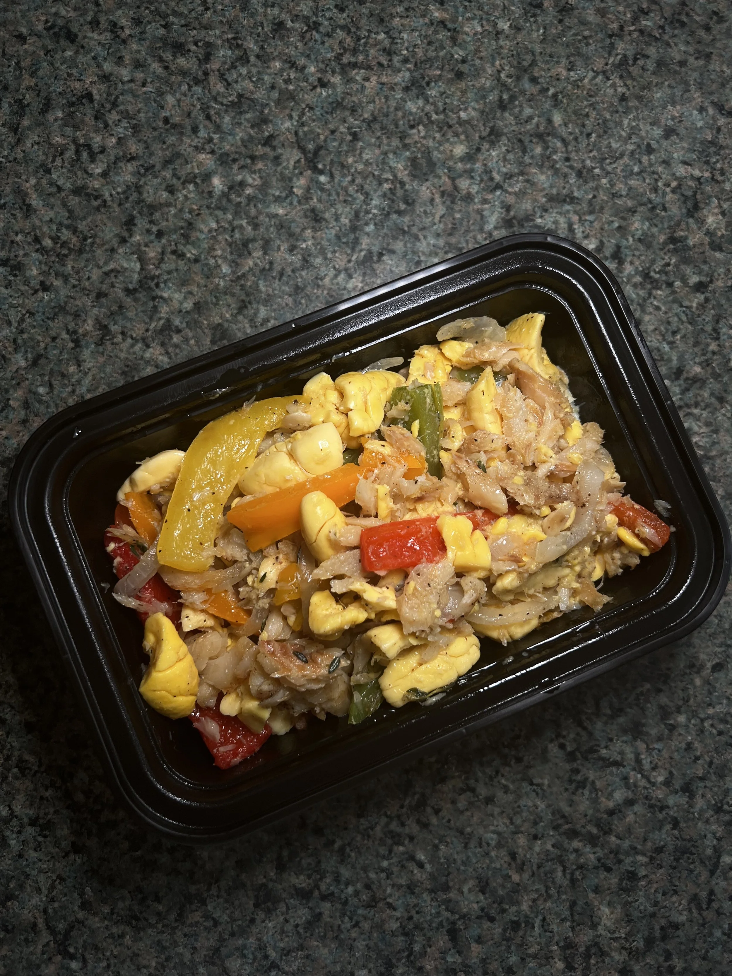 Cod fish stir-fried fried w/ackee, onion, and bell peppers